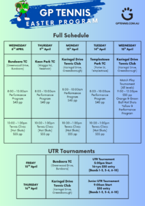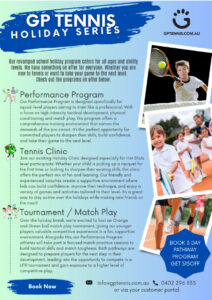 GP Tennis holiday clinics will be running at various venues over the upcoming school holidays. See the posters for details and register now!